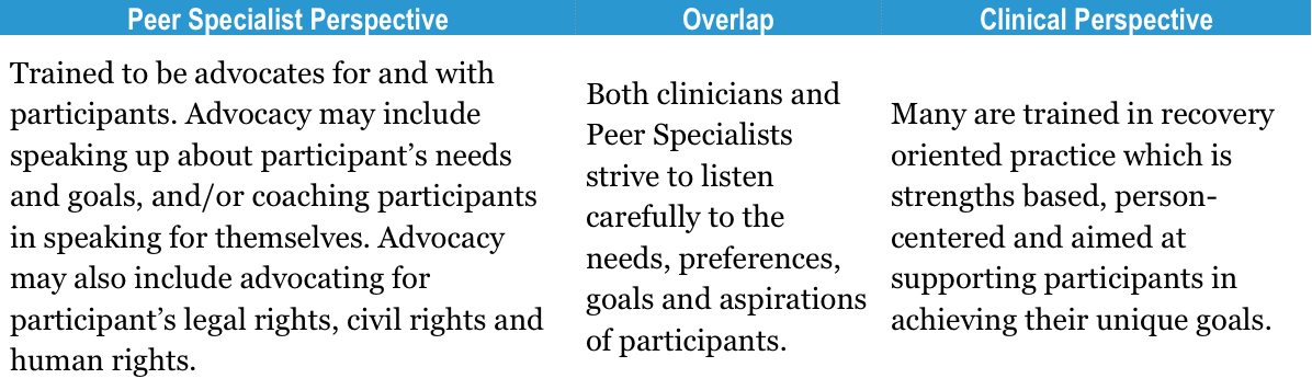 In my opinion, it is imperative that Peer Specialists remain peer. We are not junior clinicians. I've been thinking about this issue a lot lately in my work with Sascha Altman DuBrul, Iruma Bello and others at OnTrackNY. What are the differences and where is the overlap between the Peer Specialist perspective and the clinical perspective? The chart below offers some thoughts. I'd love to hear your thoughts on this important issue.